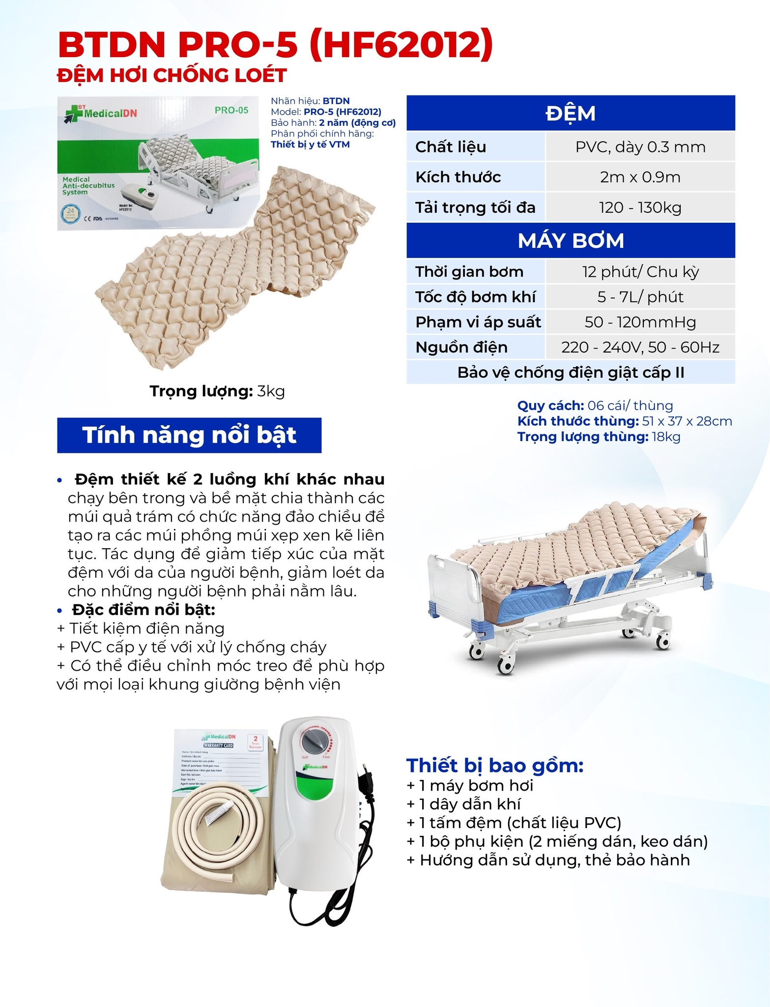 Đệm hơi chống loét BTDN PRO-5 cấu tạo gồm nhiều múi khác nhau, khi bơm hoạt động thì hơi sẽ được luân chuyển liên tục từ múi hơi này sang múi hơi khác tạo cảm giác êm ái, thoáng mát, chức năng giảm áp lực tiếp xúc lên bề mặt da, tránh lở loét cho người bệnh phải nằm lâu ngày, đặc biệt có tác dụng tránh đau nhức khi người bệnh không muốn vết đau tiếp xúc trực tiếp với giường chiếu.