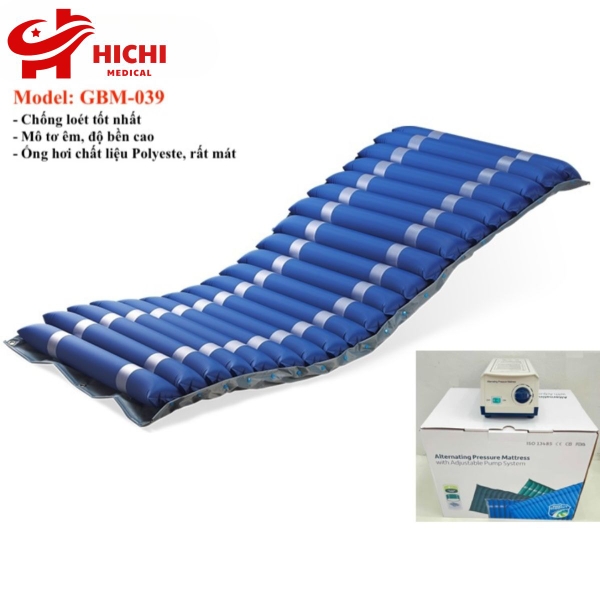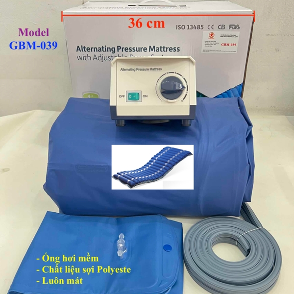 – Đệm hơi GBM-039 chống loét tốt hơn loại đệm hơi có múi hơi hình quả trám thông thường. Đệm hơi có múi hình quả trám thì múi hơi rất mỏng chỉ khoảng 3cm nên khi nằm lâu vẫn cần phải hỗ trợ để trở mình chống loét. Đối với đệm chống loét GBM-039 ống hơi ngang, đường kính ống hơi là 10 cm nên chống loét tuyệt đối không cần trở mình. Nếu người bệnh đã có hiện tượng loét thì nên dùng loại đệm này và kết hợp với chữa loét sau đó vết loét sẽ không còn tái phát: Ống hơi dày 10 cm nên vùng lưng được thả lỏng tốt hơn khi đệm đảo hơi, hình thức đảo hơi có 3 cách đó là: ống căng-ống xịt, ống xịt-ống căng và tất cả đều căng. Đệm sẽ chạy tự động để chống loét không cần sự can thiệp của con người. Chu kỳ đảo hơi là 12 phút/ 1 chu kỳ