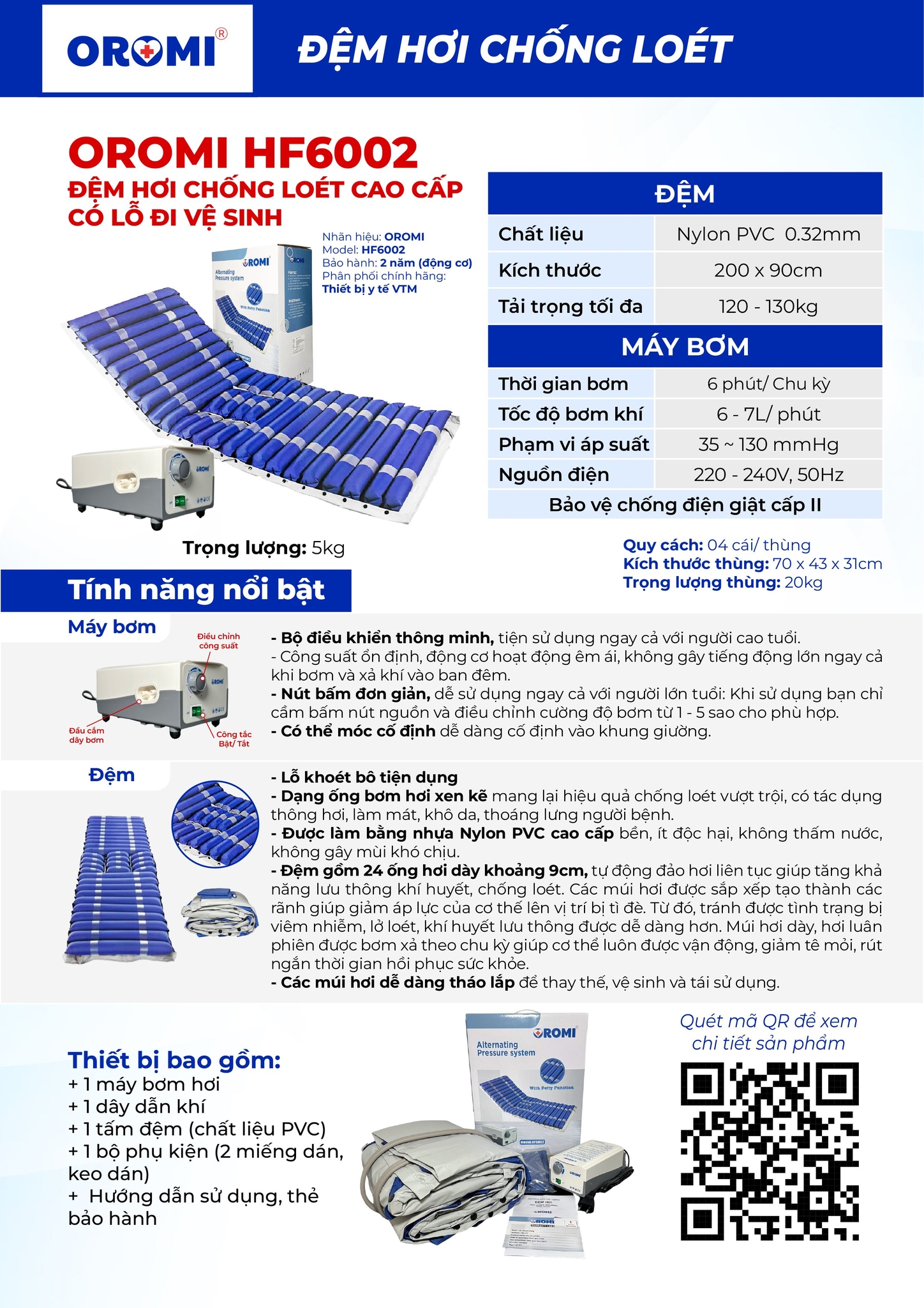 Đệm hơi chống loét có lỗ đi vệ sinh OROMI HF6002 có cấu tạo nhiều múi, khi bơm hơi sẽ được luân chuyển liên tục từ múi hơi này sang múi hơi khác tạo cảm giác êm ái, giúp giảm tối đa lực tiếp xúc lên bề mặt da, tránh lở loét, giảm đau nhức hiệu quả cho người bệnh.