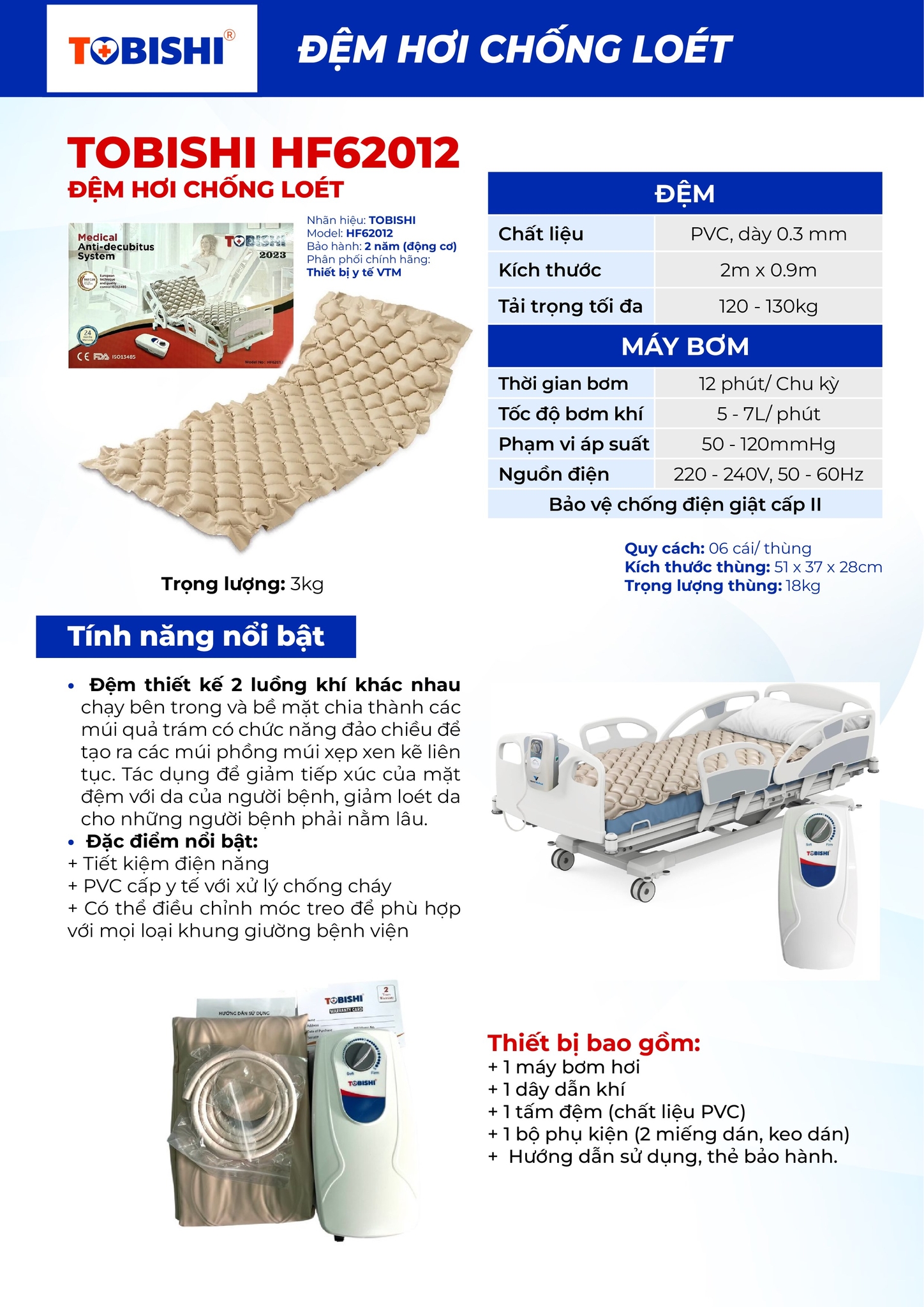 Đệm hơi chống loét TOBISHI HF62012 cấu tạo gồm nhiều múi khác nhau, khi bơm hoạt động thì hơi sẽ được luân chuyển liên tục từ múi hơi này sang múi hơi khác tạo cảm giác êm ái, thoáng mát, chức năng giảm áp lực tiếp xúc lên bề mặt da, tránh lở loét cho người bệnh phải nằm lâu ngày, đặc biệt có tác dụng tránh đau nhức khi người bệnh không muốn vết đau tiếp xúc trực tiếp với giường chiếu.