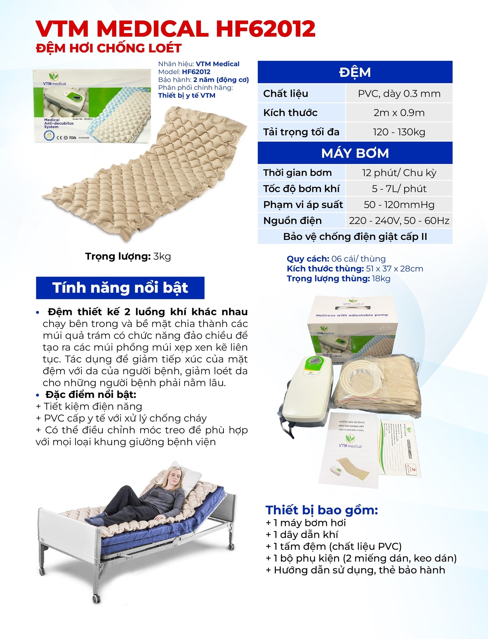 Nệm chống lở loét cho người già, người bệnh VTMMEDICAL HF62012 là một sản phẩm không thể thiếu cho các bệnh nhân cần phải nằm tại giường trong thời gian dài (trên 15h một ngày) giúp ngăn chặn, chữa trị và phòng ngừa chứng lở loét da do nằm lâu của các bệnh nhân như: người bị liệt, phỏng, gãy xương, sau phẫu thuật và người già (người cao tuổi).