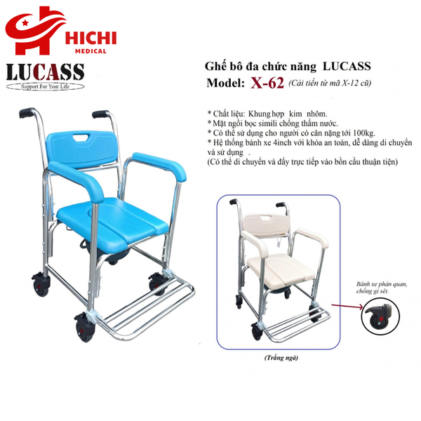 Ghế bô vệ sinh Lucass X-62 được tích hợp 4 bánh xe, có thể sử dụng như một xe lăn đơn giản, giúp hạn chế được nhiều rủi ro cho người sử dụng khi vào nhà tắm.