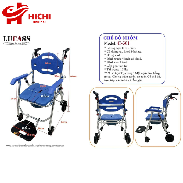 - Ghế bô vệ sinh Lucass C301 là dòng xe thiết kế đa năng được sản xuất bởi thương hiệu Lucass nhằm mục đích vừa để cho bệnh nhân đi vệ sinh tại chổ và vừa có thể dùng làm xe đẩy bệnh nhân đi tắm thuận tiện. Thiết kế khung xe đẩy bệnh nhân đi tắm 301 được làm từ khung hợp kim nhôm, có thể tắm rửa mà không sợ bị rỉ sét. Các vị trí như bệ ngồi và lưng ghế được làm từ nhựa ABS bên bỉ và sạch sẽ.