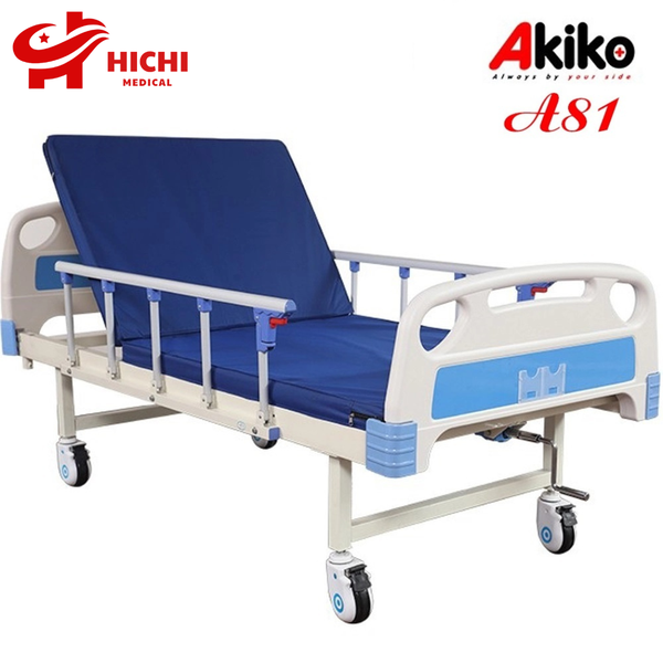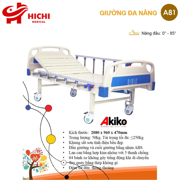 - Giường bệnh nhân AKIKO A81 là sản phẩm giường bệnh có tay quay ở phần nâng đầu giúp cho người bệnh trở mình dậy dễ dàng và hỗ trợ người chăm sóc thuận tiện hơn.