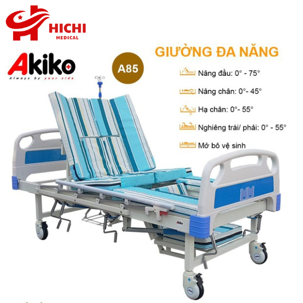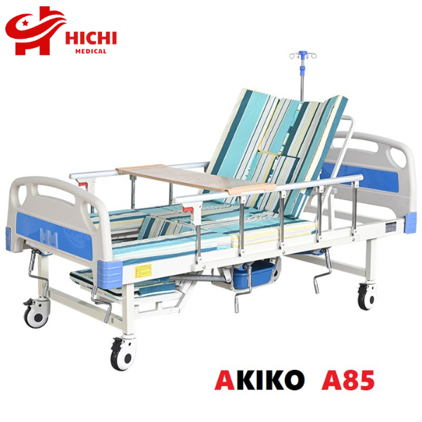 - Giường bệnh nhân 5 tay quay Akiko A85 sản xuất bởi thương hệu AkiKo Nhật Bản.Giường bệnh nhân 5 tay quay Akiko A85 thiết kế hỗ trợ tốt nhất cho người bệnh, người già trong quá trình chăm sóc điều trị. Người bệnh, người cao tuổi được nằm điều trị trên giường bệnh này sẽ luôn có cảm giác thoải mái, dễ chịu, hồi phục sức khỏe nhanh hơn, chất lượng chăm sóc tốt nhất. Đặc biệt với thầy thuốc, người nhà chăm sóc sẽ vơi bớt đi nỗi vất vả trong quá trình phục vụ bệnh nhân, phục vụ người cao tuổi. Giường bệnh nhân 5 tay quay Akiko A85 có 5 tay quay tương ứng với các chức năng: nâng đầu, nâng hạ chân, sử dụng bô vệ sinh, nằm nghiêng sang trái, nằm nghiêng sang phải