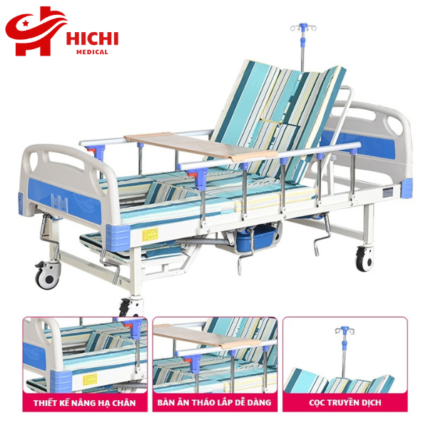 Giường thiết có bô cho người bệnh đi vệ sinh ngay trên giường. Sử dụng 1 tay quay di chuyển bô vào vệ trí được khoét lỗ trên giường để người bệnh đi vệ sinh. Sau khi vệ sinh xong, người chăm sóc sử dụng tay quay để di chuyển bô ra dễ dàng và trả giường về tư thế bình thường. Tính năng nay thực sự tiện dụng với những bệnh nhân nặng.