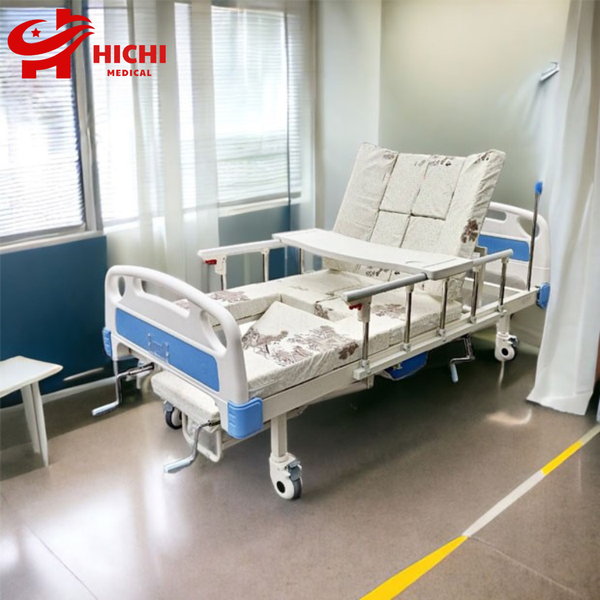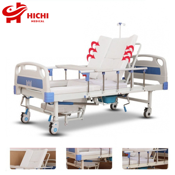- Chức năng bô vệ sinh tại giường: Giường với trang bị chức năng bô vệ sinh tại giường giúp người bệnh có thể đi vệ sinh ngay tại giường khi cần thiết mà không cần phải di chuyển vất vả vào nhà vệ sinh như trước đây. Chúng ta chỉ cần sử dụng chiếc tay quay được gắn với chức năng bô vệ sinh thì miếng nệm sẽ tự động tụt xuống và chiếc bô vệ sinh chờ sẵn ở dưới giá sẽ di chuyển vào đúng ngay lỗ bô đã định sẵn để người bệnh đi vệ sinh.