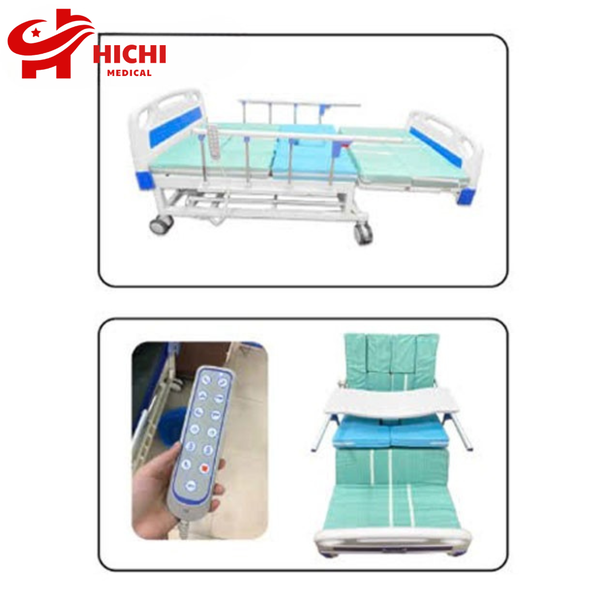 - Giường điện bệnh nhân đa chức năng tuỳ chỉnh bằng điều khiển cầm tay: nâng/hạ lưng, nâng/hạ chân, nghiêng trái/phải, điều khiển bô vệ sinh,