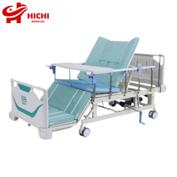 Giường y tế điện bệnh nhân đa chức năng tuỳ chỉnh bằng điều khiển cầm tay: nâng/hạ lưng, nâng/hạ chân, nghiêng trái/phải, điều khiển bô vệ sinh. Khung giường bằng thép sơn tĩnh điện chắc chắn, chịu tải trọng tốt. Khi mất điện có thể sử dụng tay quay như giường cơ.