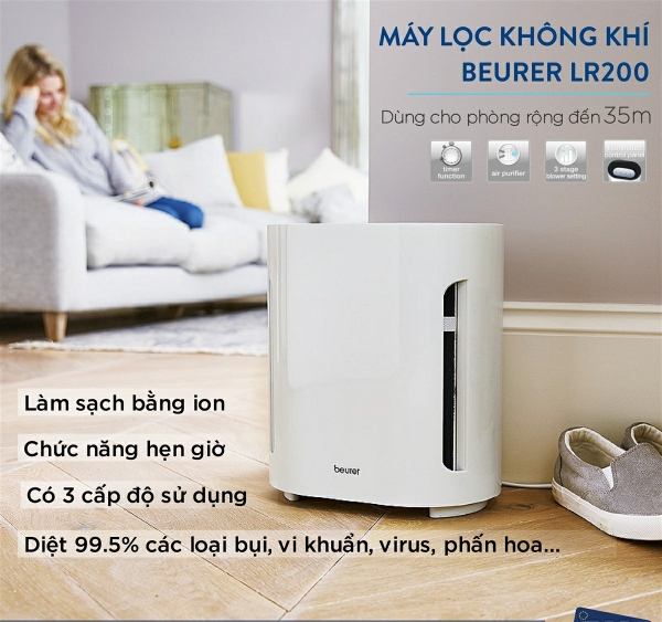 - Đặc biệt thích hợp lọc khí cho phòng có người già, trẻ nhỏ, người mắc các bệnh về đường hô hấp và phổi. Máy lọc không khí ion LR200 Làm sạch không khí thông qua hệ thống lọc ba lớp ( tấm lọc trước + tấm lọc các bon hoạt tính + tấm lọc EPA E 12)