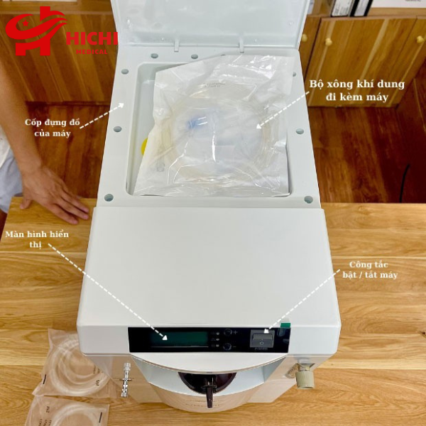 | Phụ kiện theo máy gồm | 1 dây thở Oxy 5m và 1 dây 1.8m, 2 màng lọc thay thế, 1 bộ xông khí dung |