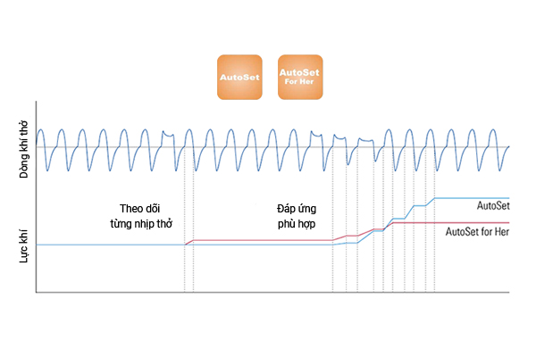 - Thuật toán Autoset for Her được tối ưu cho phụ nữ. Phụ nữ thường ít ngưng thở, nhiều giảm thở, khó vào giấc ngủ lại dễ thức giấc. Nên thuật toán tăng độ nhạy đáp ứng với giảm thở, thay đổi áp lực khí nhẹ nhàng, tránh làm ảnh hưởng đến giấc ngủ.
