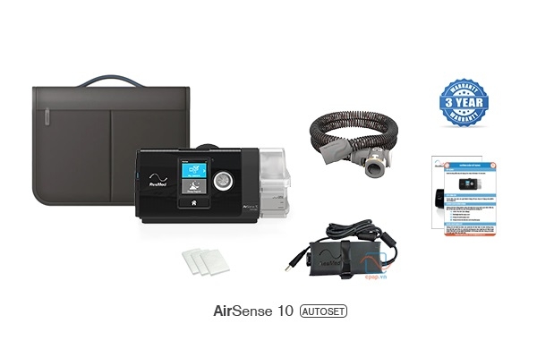 - Máy trợ thở Resmed Airsense 10 Autoset là dòng máy trợ thở CPAP mới nhất của hãng ResMed chuyên điều trị hội chứng ngưng thở khi ngủ OSA. Máy trợ thở Resmed Airsense 10 AutoSet có tất cả các ưu điểm của dòng máy S9, và còn được nâng cấp cao hơn máy sẽ tự động điều chỉnh lượng áp xuất khí phù hợp với người dùng . Máy giúp điều trị chứng ngáy ngủ và ngưng thở khi ngủ. Với thiết kế hiện đại, nhỏ gọn, tinh xảo. Tất cả chức năng đều hoàn toàn tự động, giúp đường thở luôn thông suốt cả đêm. Airsense 10 Autoset đi kèm với 1 máy làm ẩm Humidair tích hợp và xây dựng trong một nền tảng không dây có thể kết nối với đội ngũ chăm sóc y tế.