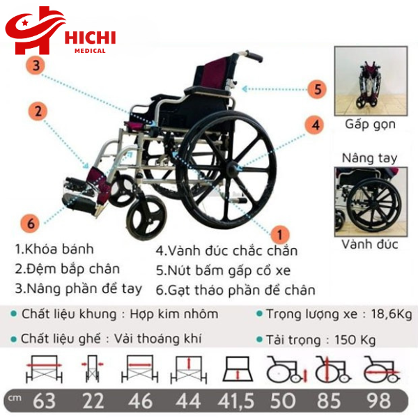 - Xe lăn có độ rộng ghế ngồi là 46cm, sâu 41,5cm, độ rộng của cả xe là 63cm, chiều cao xe là 90cm, cao tựa lưng là 50cm và thành xe cao 22cm, chiều cao từ đất lên chỗ ngồi là 50cm.