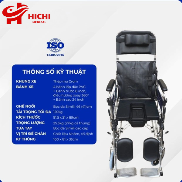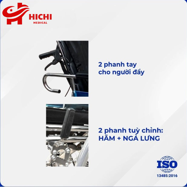 - Xe lăn có 4 phanh tay, bánh xe chống lật đảm bảo an toàn.