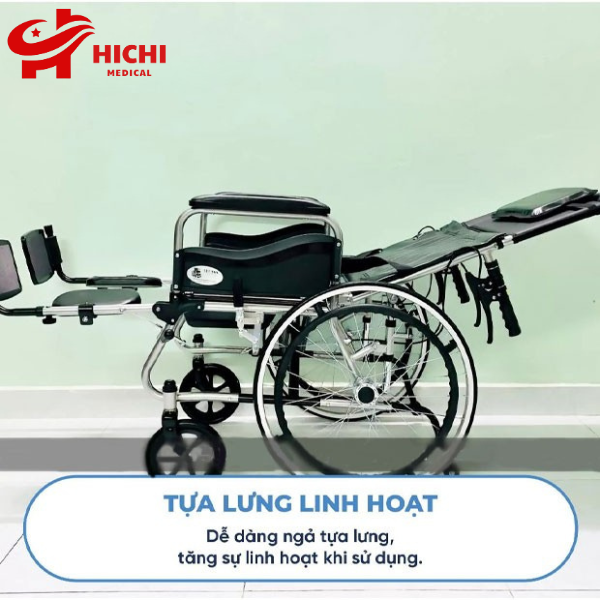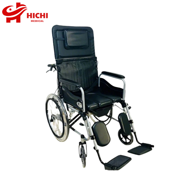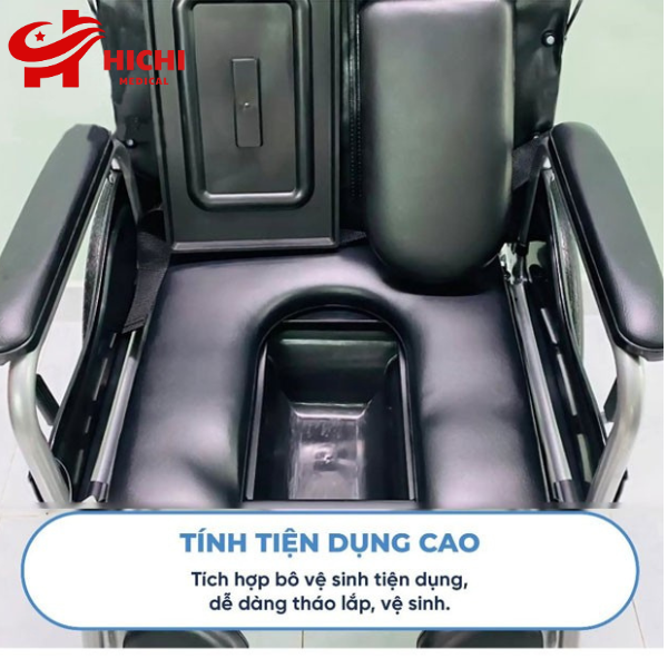 - Xe lăn có bô vệ sinh tích hợp trên xe, xe có chức năng ngả lưng nhiều chế độ, nâng hạ phần để chân cho người sử dụng, phần để tay 2 bên có thể nâng lên giúp người sử dụng có thể dễ dàng di chuyển từ giường lên trên xe lăn.