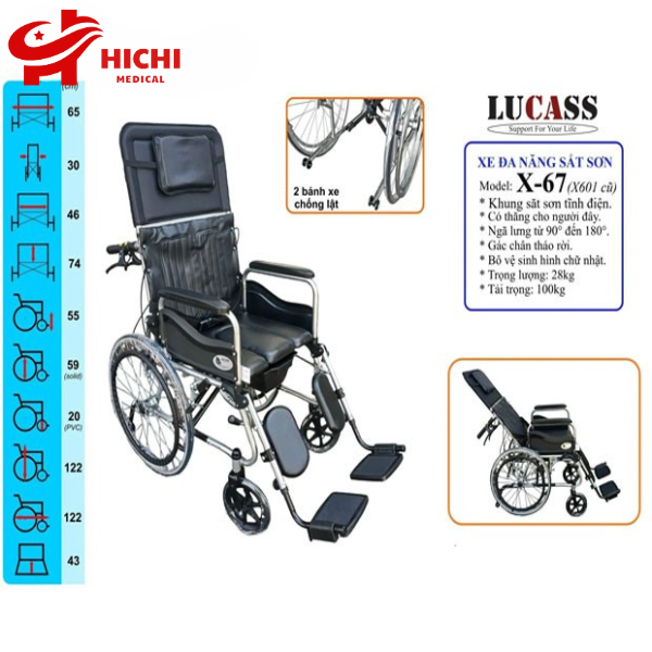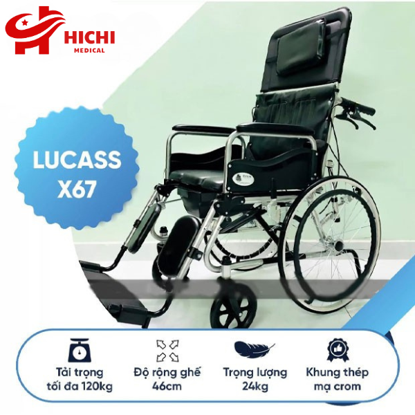 Xe lăn Lucass X67 thuộc dòng xe lăn đa năng giống như xe lăn Lucass X7, X7A, X72, X37BJ. Xe có bô vệ sinh, ngả nằm như giường và có chống lật.