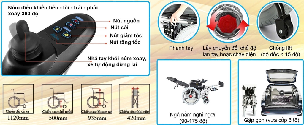 Xe lăn điện Akiko A92 điều khiển bằng cần gạt trên thành xe, đồng thời có thể lăn bằng tay khi hết điện, thuận tiện cho người sử dụng là người già yếu, người khuyết tật.