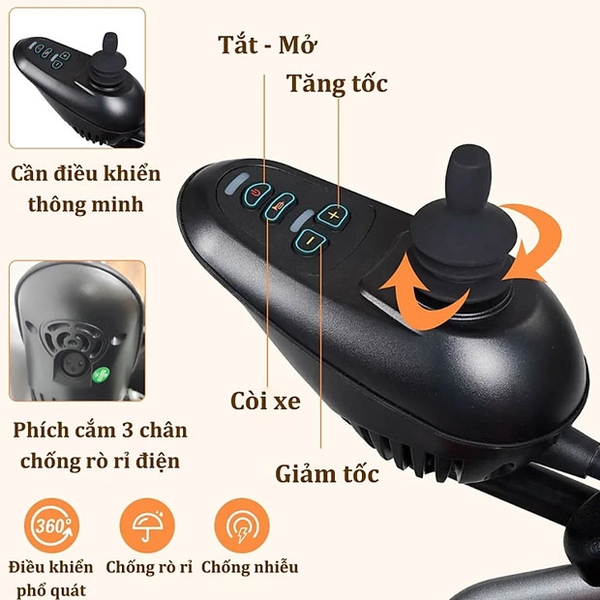Cần điều khiển xe Lăn Điện Lucass X-301 dễ dàng thao tác: trên cần điều khiển có các nút điều chỉnh tăng giảm tốc độ, kèn báo hiệu, nút tắt bật và hệ thống đèn báo pin và tốc độ chúng ta dễ dàng điều chỉnh các nút bấm và dễ dàng thao tác cần điều khiển khi tới lùi rẽ trái phải.