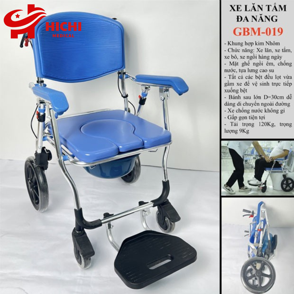 - Xe lăn tắm có bô đa năng GBM-019 là dòng xe cao cấp sang trọng, gấp gọn phù hợp cho đi du lịch, đi dạo chơi, đi khám bệnh và di chuyển hàng ngày