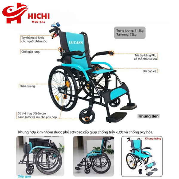 Thông số xe lăn khung nhôm siêu nhẹ Lucass X63L New
